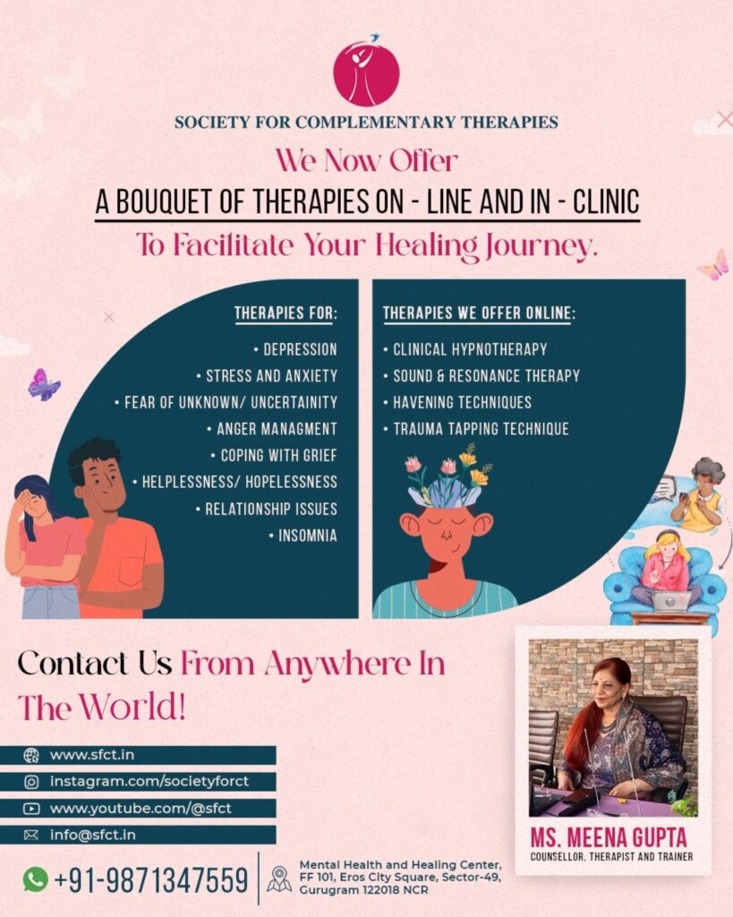 The Society for Complementary Therapies was therefore established in 2014 to go beyond Counseling and to address this unmet need for promoting mental health and fitness with the help of proven non-invasive Alternative and Complementary Therapies such as Clinical Hypnotherapy, Music Therapy, Art therapy, Foot Reflexology, Bio-guided Neuropathy, Acupressure and Yoga.