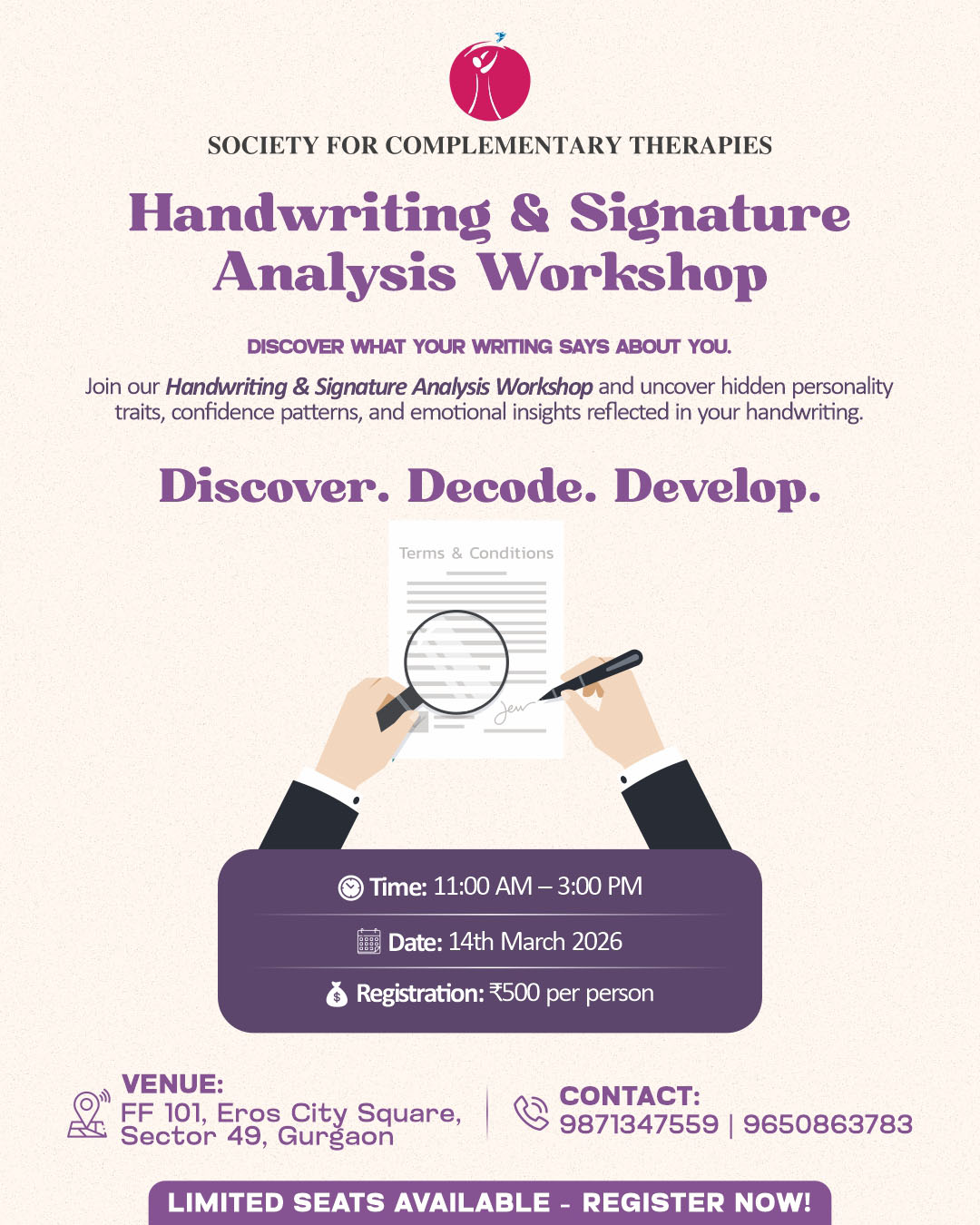14 Mar 11.00 AMFF 101, Eros City Square, Sector 49, GurgaonDecode Your Handwriting. Discover Your Tru
